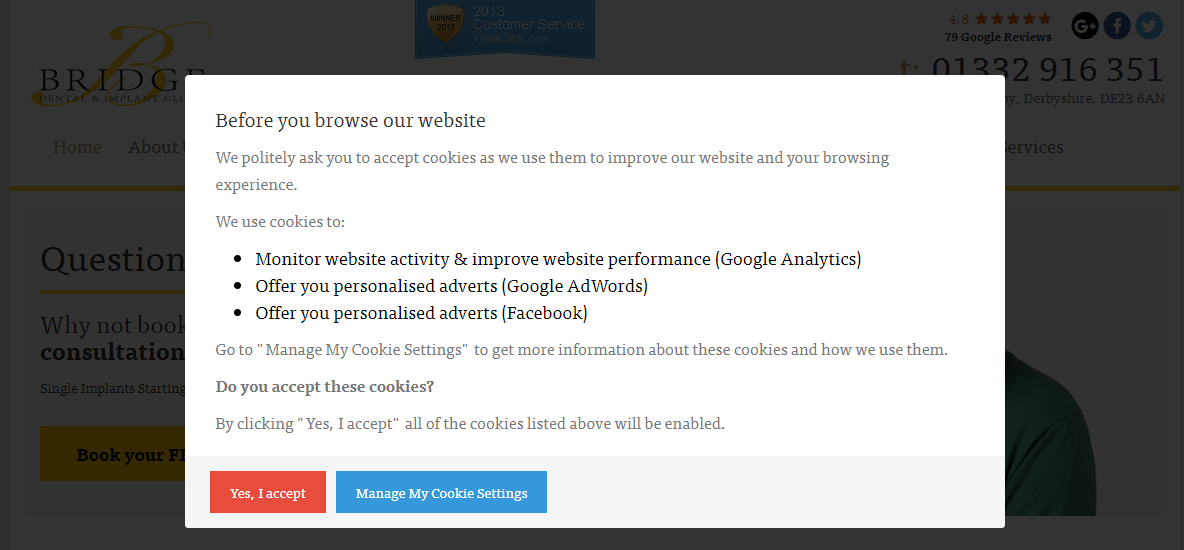 The new law affects not just the way we look after confidential patient data, but also how we manage our website. Here at Bridge Dental Clinic in Derby, we are committed to pursuing excellence in every area of our work – from the exceptional level of dental care we offer through to the experience we offer our website visitors.