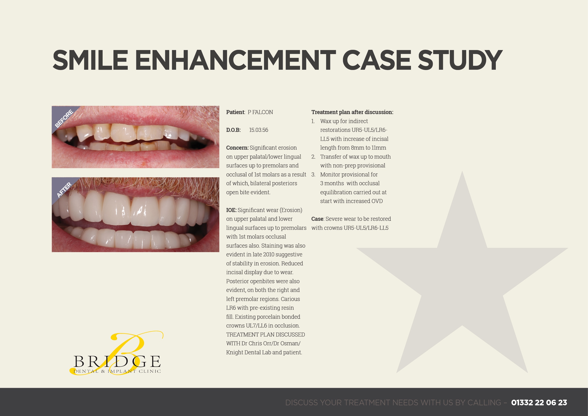 He initially presented to us after becoming aware that over a period of time his teeth appeared to be wearing away, had become discoloured and that his bite felt ‘odd’. After a complete assessment with our team of clinicians and lab technician a treatment plan was put in place to restore the teeth with laboratory made restorations which would not only protect and improve the appearance of his teeth, but would restore him to full function too.