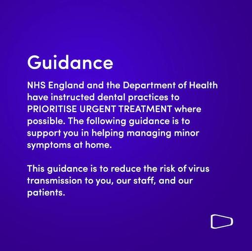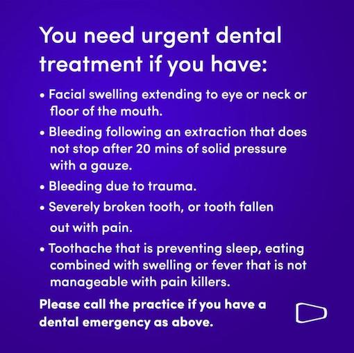 We would like our patients to know we are still at this current moment, providing a well managed emergency service for ONLY the severe emergencies, such as Bleeding, Swelling and Toothache. Please call the Practice 01332 364630 and an advisor will be on hand to triage your emergency.